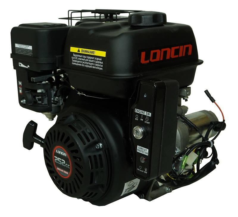 Одноцилиндровый двигатель/ объем 252 куб.см/ 8.5 л.с/ горизонтальный вал 20 мм/ электрический и ручной запуск/ катушка освещения 5А